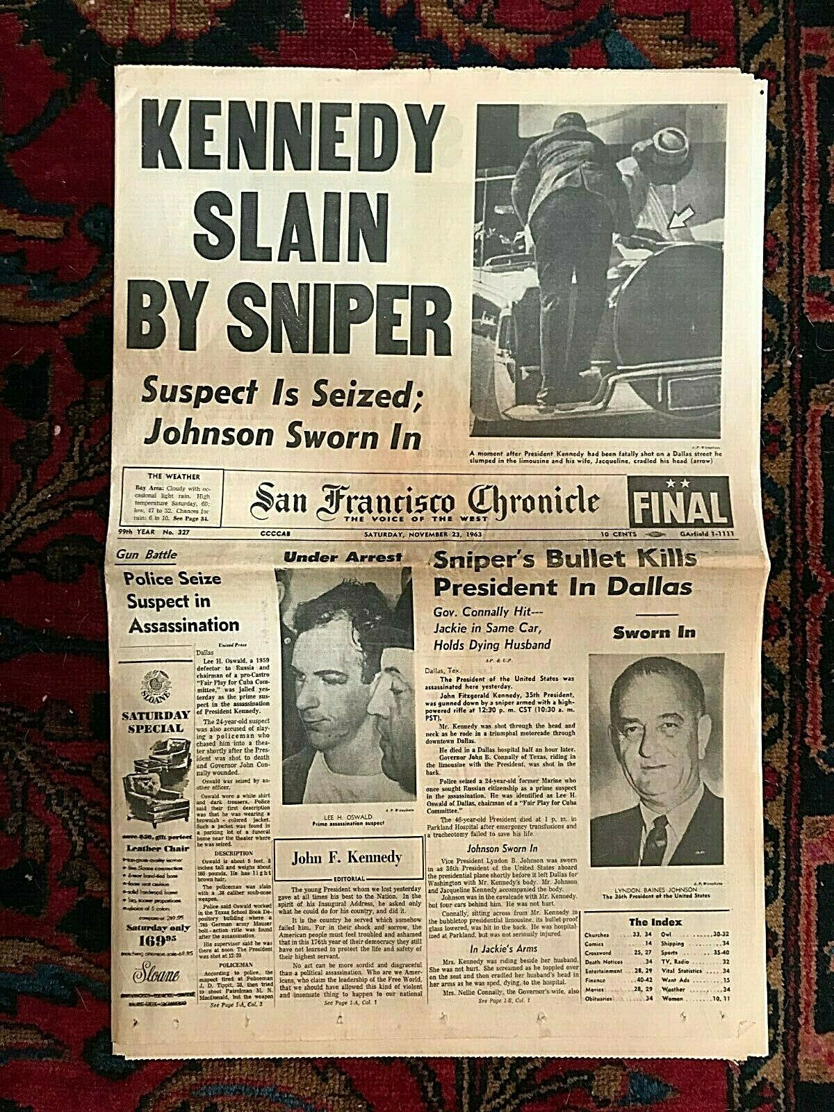 Title (ebay affiliate link): Kennedy Slain by Sniper Banner Headline San Francisco Chronicle