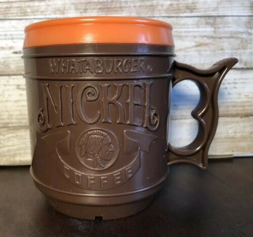 Title (ebay affiliate link): Vintage Whataburger Buffalo Nickel Cup Plastic Coffee Travel Mug Brown Orange.