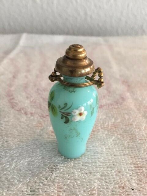 Title (ebay affiliate link): VINTAGE ENAMEL DECORATED OPALINE AQUA BLUE CHATELAINE SCENT/PERFUME BOTTLE