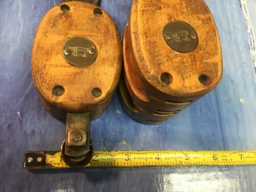 Title (ebay affiliate link): 2 piece Llarge Vtg Double Wood Anvil Logo Pulleys Block & Tackle Iron Hooks