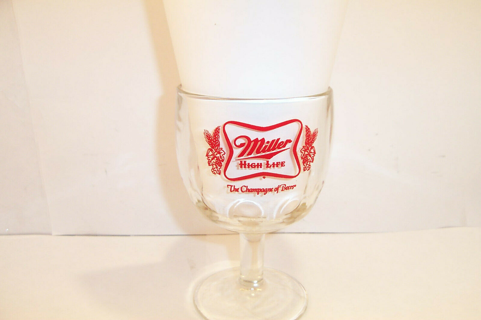 Title (ebay affiliate link): Miller High Life "The Champagne of Beers" Beer Goblet Thumb Print Glass 6" Tall