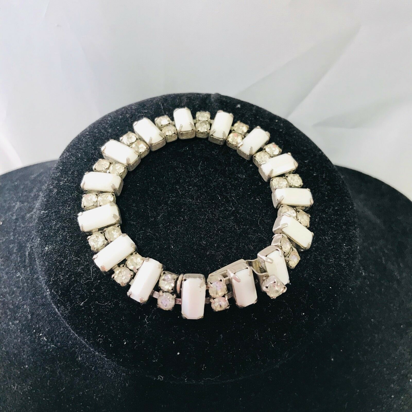 Title (ebay affiliate link): Vintage Silver Tone White Milk Glass Prong Set Rhinestone Link Bracelet
