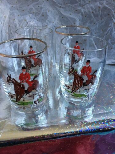 Title (ebay affiliate link): 4 X Vintage Hunting Scene Gold Rim Shot Glasses