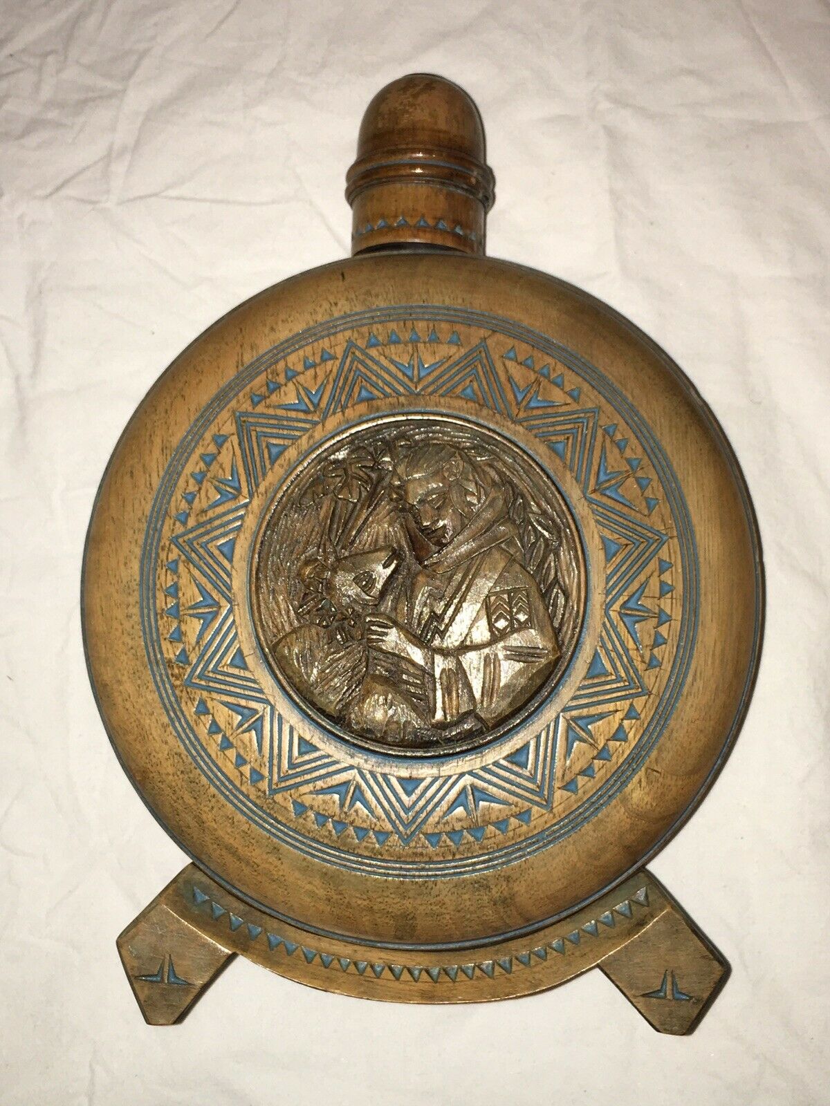 Antique Vintage Carved Wood Canteen Flask Wine Wooden Bottle Free Standing