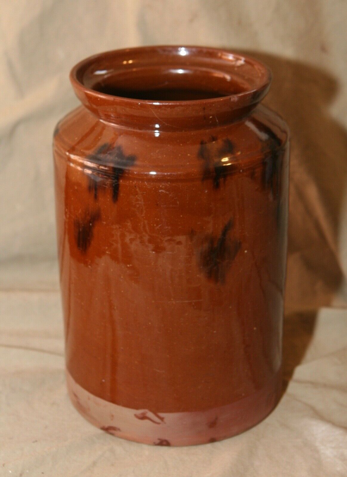 Title (ebay affiliate link): Antique 9" Manganese Sponge Drip Redware Preserve Storage Jar Broken Lip
