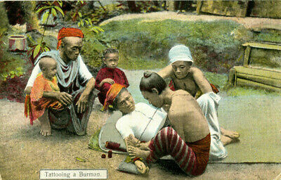 Title (ebay affiliate link): 1920s postcard Tattooing a Burman Burmese man BURMA