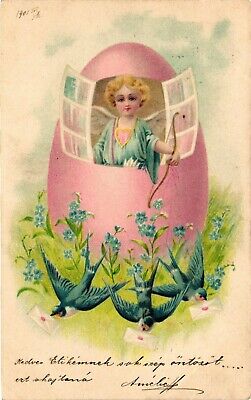 Title (ebay affiliate link): Easter, Angel in an Egg House with Birds, Old Postcard 1901