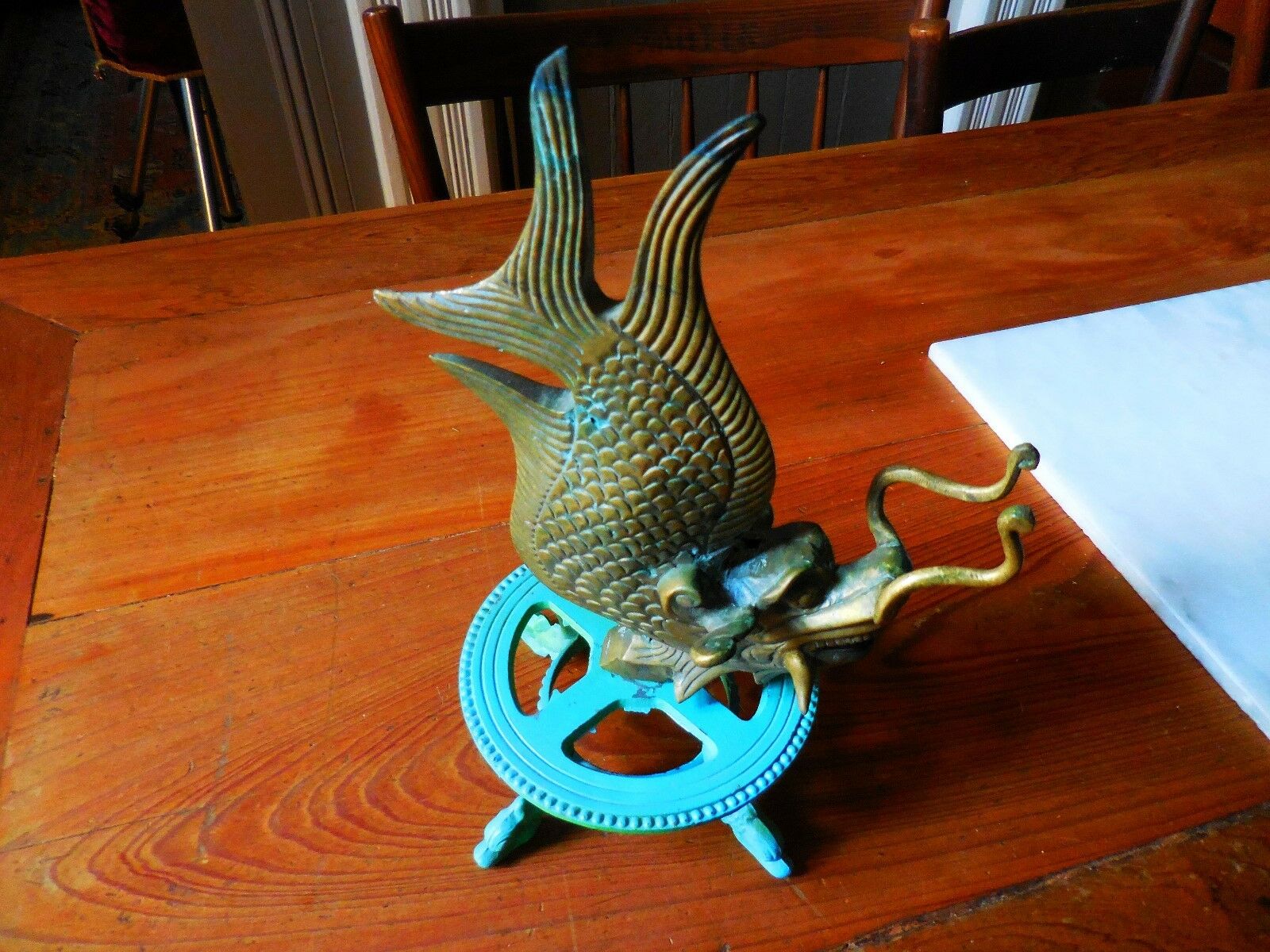 Title (ebay affiliate link): Antique brass fish. Asian. Large, heavy. Circa 1940 w/ patina. On dolphin base.