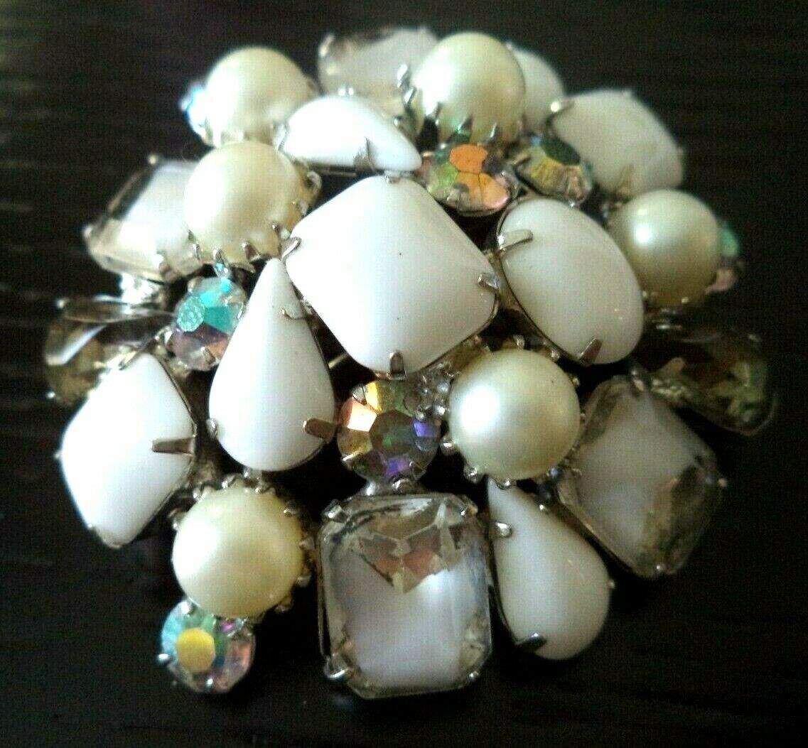 VINTAGE ESTATE HIGH END AB RHINESTONE MILK GLASS DOMED FLOWER 2 1/4 BROOCH G475F