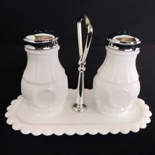 Title (ebay affiliate link): VINTAGE MILK GLASS EAGLE SALT & PEPPER SHAKERS WITH caddy EUC G2