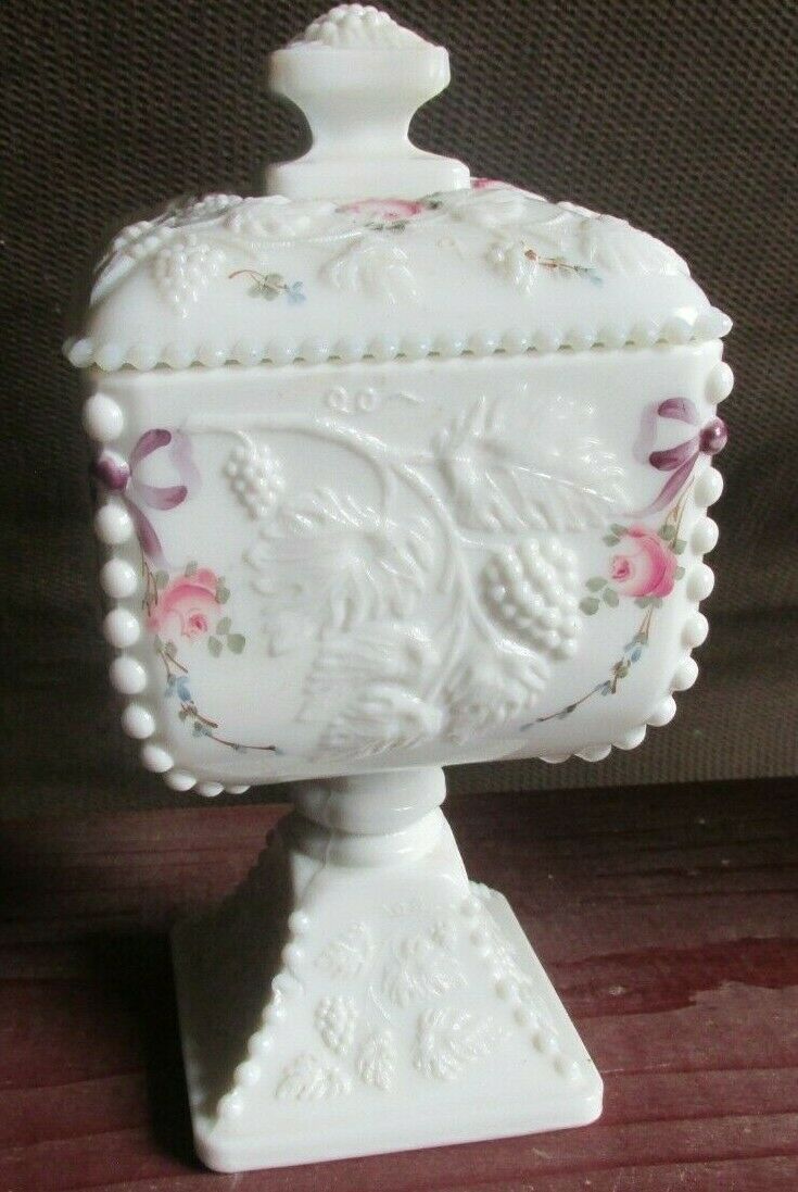 Westmoreland Milk Glass Hand Painted Roses & Bows Wedding Compote w/Lid Beaded