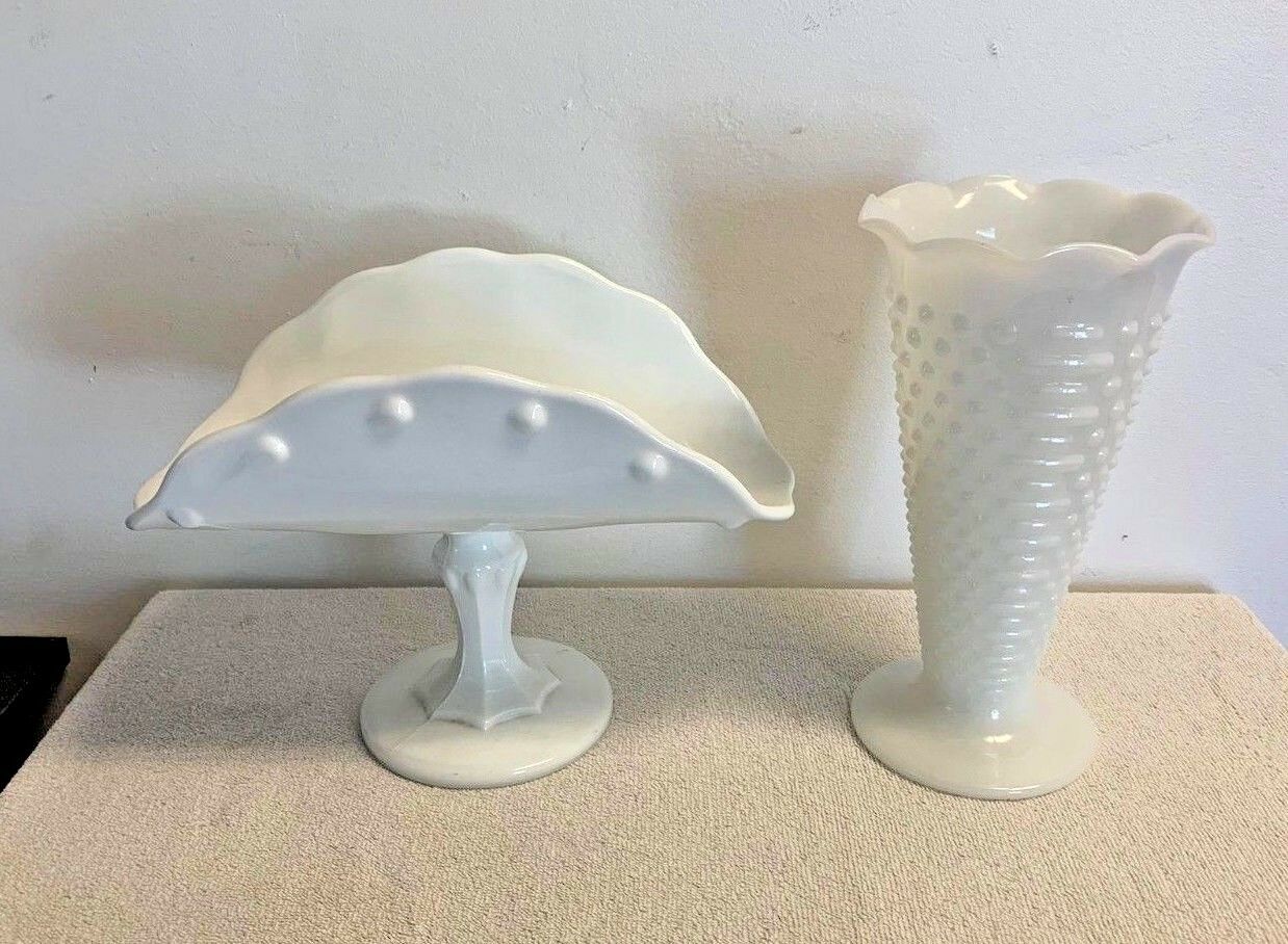 Vintage White Milk Glass Banana Grape Holder & Hobnail Vase