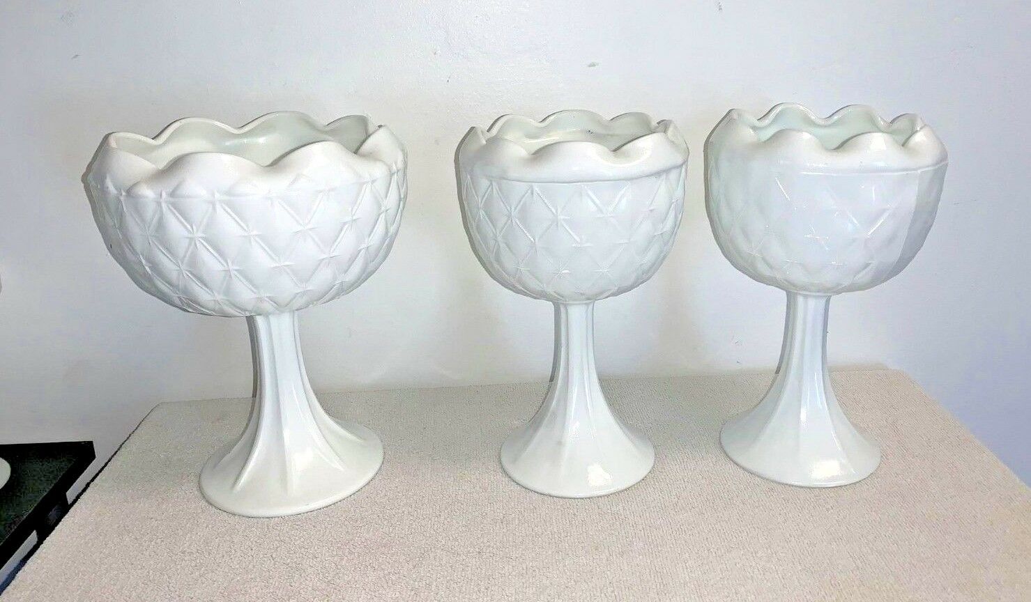 Lot of 3 Vintage Large White Milk Glass Goblet Bowl Dish Pedestal Diamond