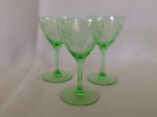 Title (ebay affiliate link): Set Of 3 Etched Green Depression Glass Cordials Sherry Wine Stems