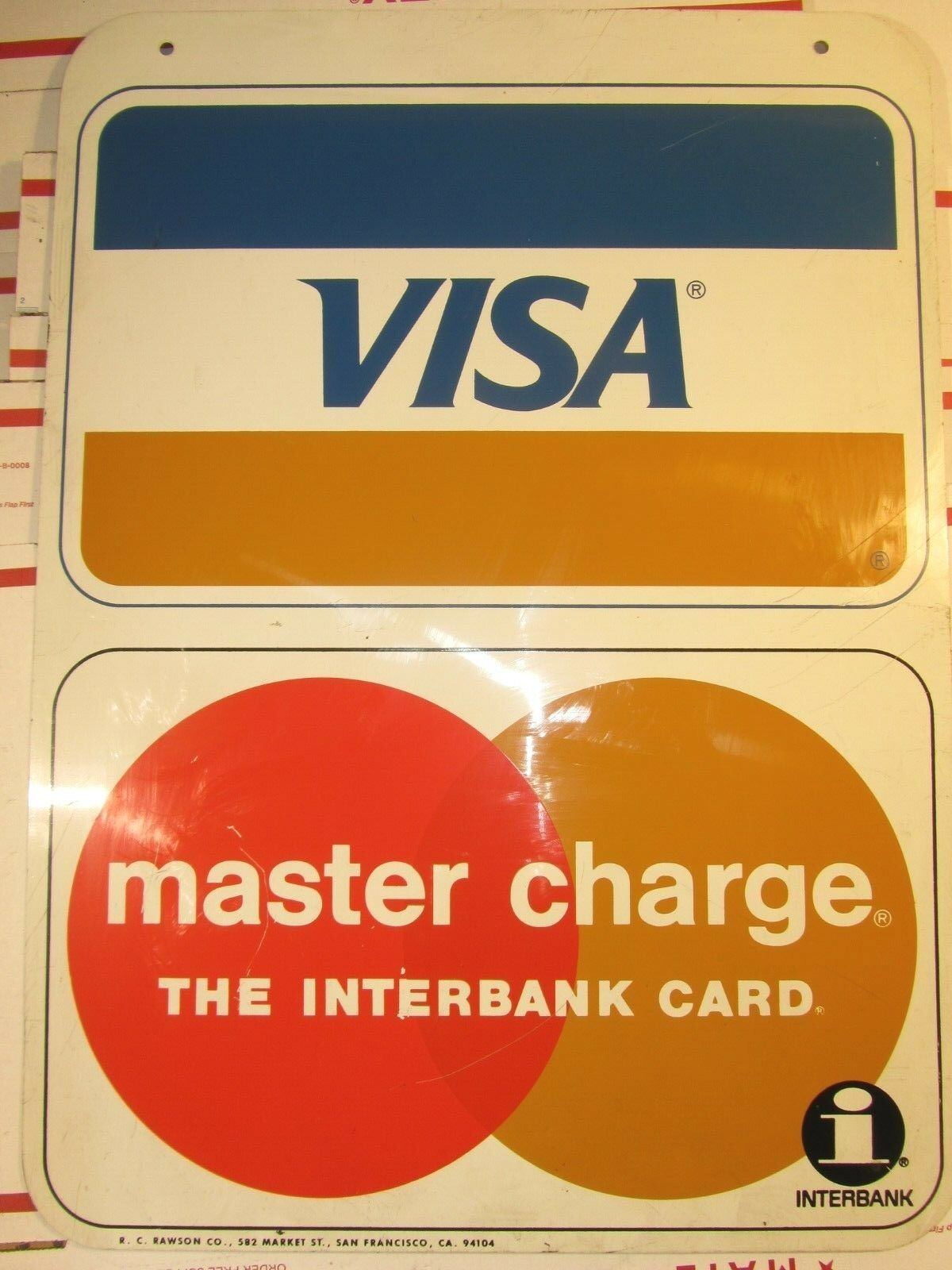 Title (ebay affiliate link): Vintage 22" X 16" Visa / Master Charge Interbank Metal Double-Sided Sign