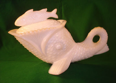 Old White Milk Glass Whale Fish Lid Candy Dish Bowl