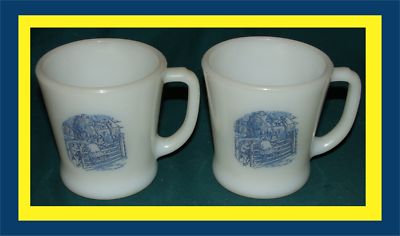 2 Vtg Currier & Ives Pattern Milk Glass Coffee Mug Cups