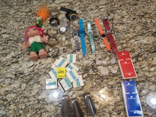 JUNK DRAWER LOT OF VINTAGE WATCHES, SHOE HORNS, COINS, KEY CHAIN, NEW PLAYING...