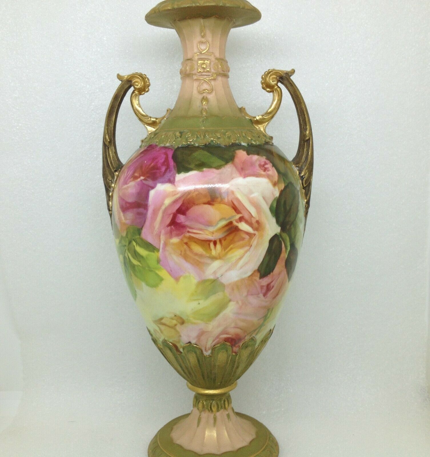 Antique Vienna Austria ROSE FLOWER VASE Gold Ornate Handles Signed Rene 10" Tall