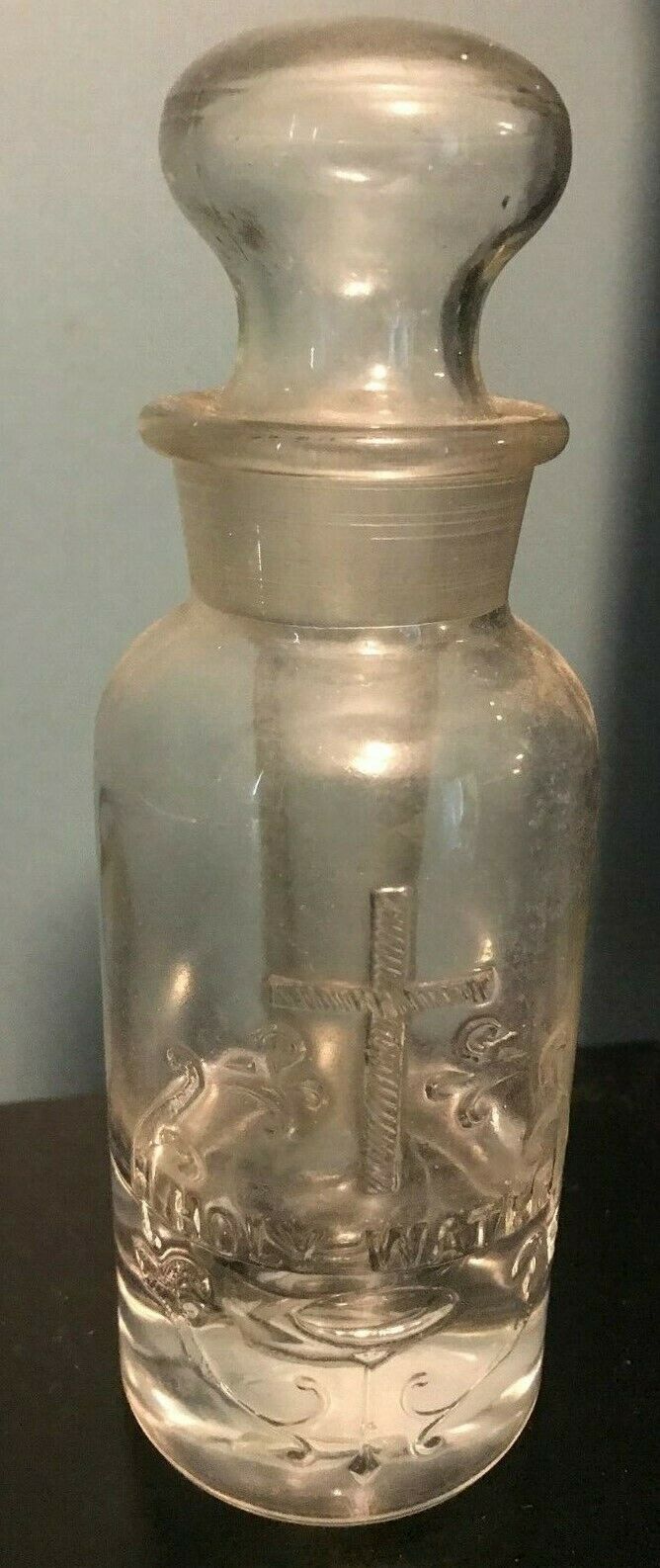 BEAUTIFUL OLD ANTIQUE CARMELITE NUNS CONVENT LARGE GLASS HOLY WATER BOTTLE