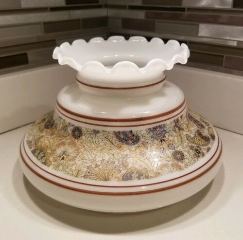 Milk Glass 10" Fitter Hurricane Lap Shade Ruffle Top White Brown Blue Paisley