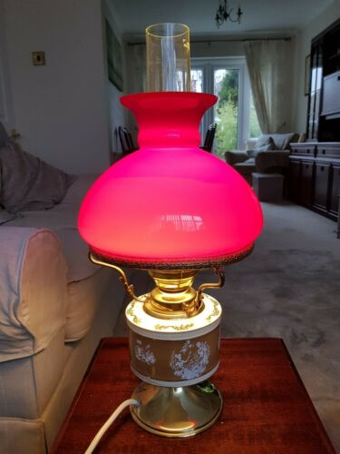 vintage style Oil Lamp converted to electric, Red Glass Shade & Glass Chimney