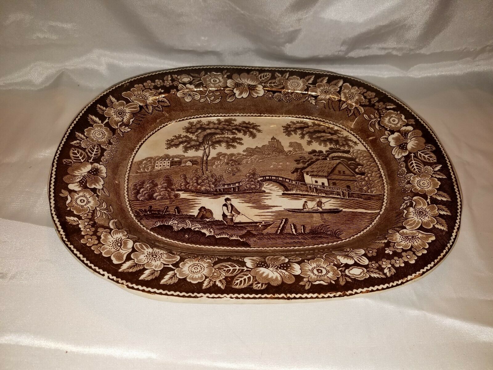 Antique Vintage Rectangular Platter Brown Ironstone Transferware