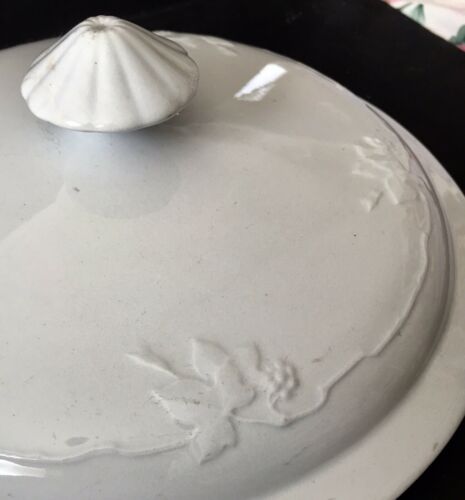LOVELY ANTIQUE WHITE IRONSTONE CHAMBER POT LID Leaf & Berry Heavy Staffordshire