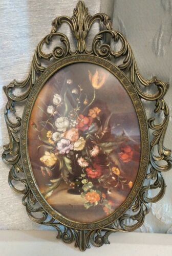 Vintage Victorian Metal Oval Picture Frame Florals Made In Italy - Bubble Glass