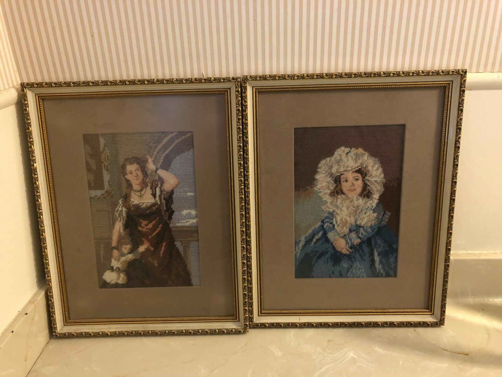 Two Antique Women Needlepoint in Ornate Resin Picture Frames Vintage Wall Decor