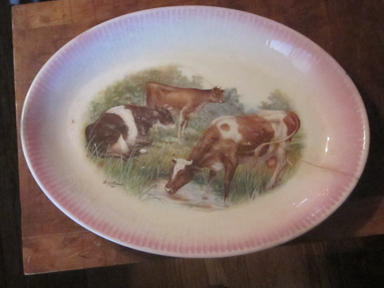 Title (ebay affiliate link): Antique R. K. Beck Transferware "Grazing Cows" Serving Platter or Tray Pottery