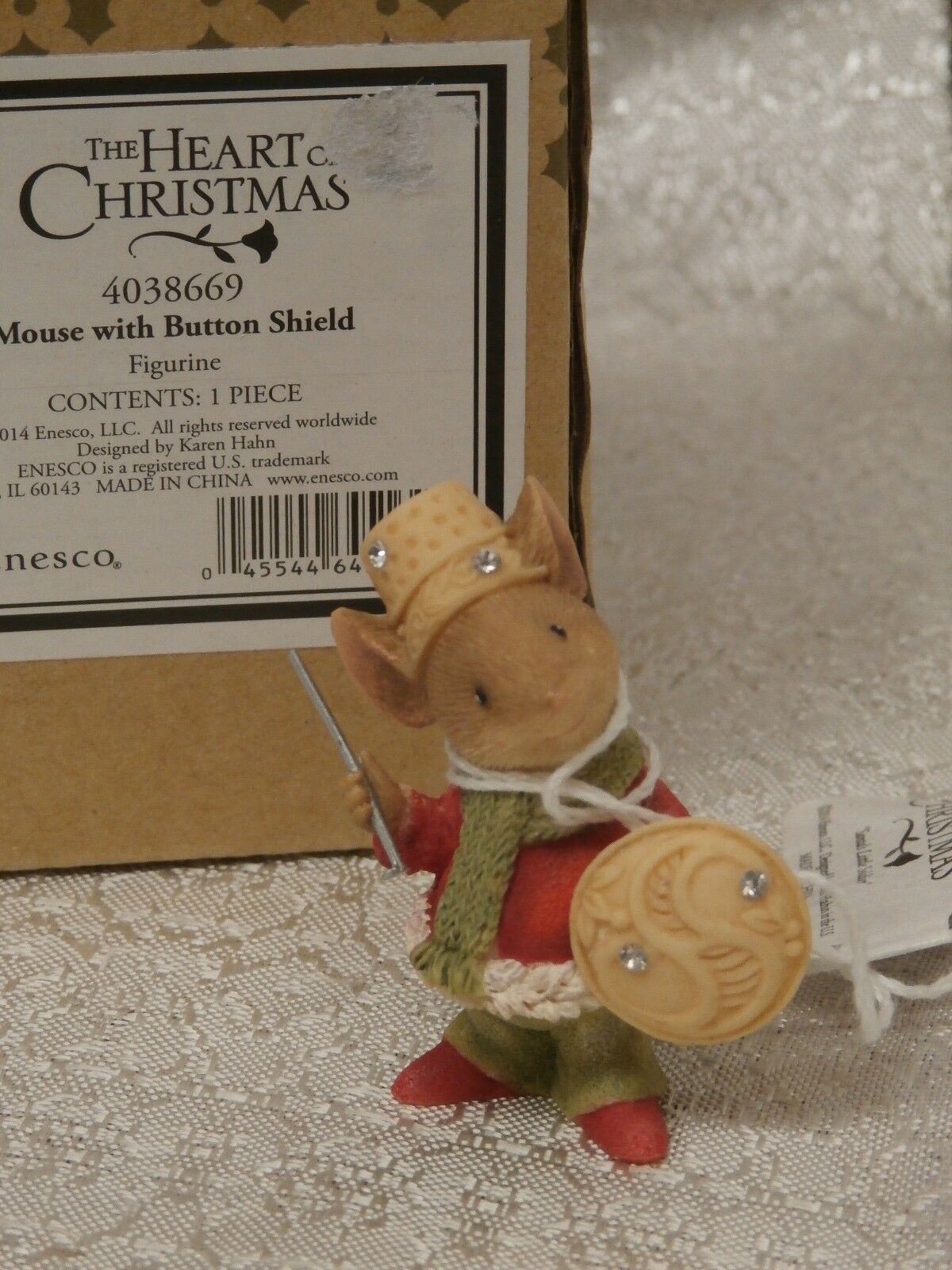 Title (ebay affiliate link): The Heart of Christmas Karen Hahn Mouse with Button Shield 4038669 Enesco NIB