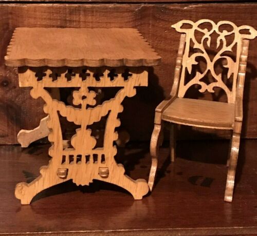 Antique Primitive Miniature Dollhouse Doll Toy Wood Ornate Table Chair AAFA