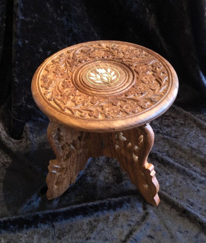 Title (ebay affiliate link): VTG Carved Indian Sheesham Wood with Inlay Flower Tripod Stand Plant Stand India