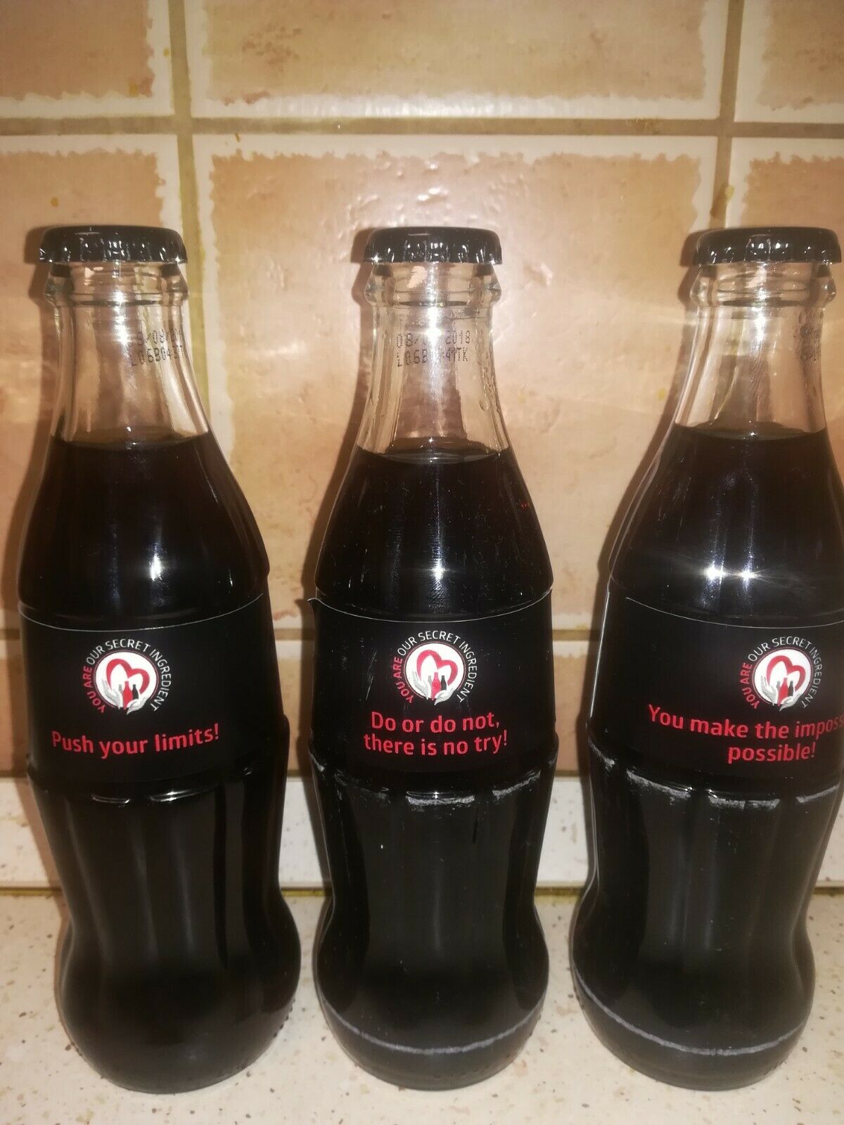 Rare Coca-Cola full glass bottle - unique labeled - english label 3 pcs set 2018