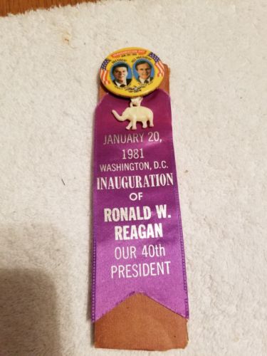 Title (ebay affiliate link): 1 3/4" RONALD REAGAN INAUGURATION DAY PIN WITH RIBBON And ivory colored elephant