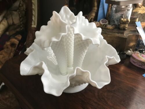 Title (ebay affiliate link): Vintage Fenton Hobnail Milk Glass Bowl Ruffled Edge with Flower Frog