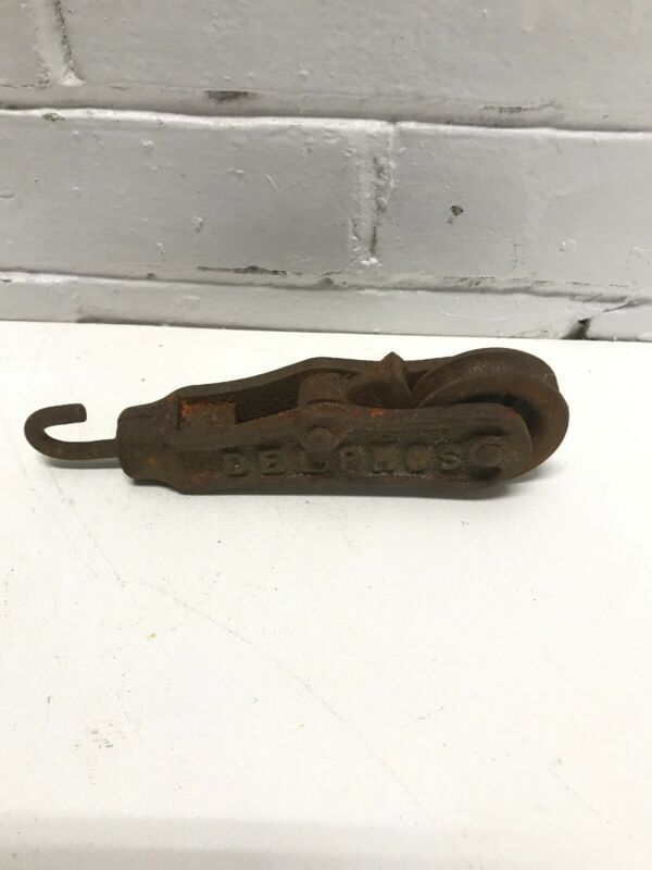 Vintage Metal Block Barn Pulley Iron Hook Vintage Tools Marked Delphos