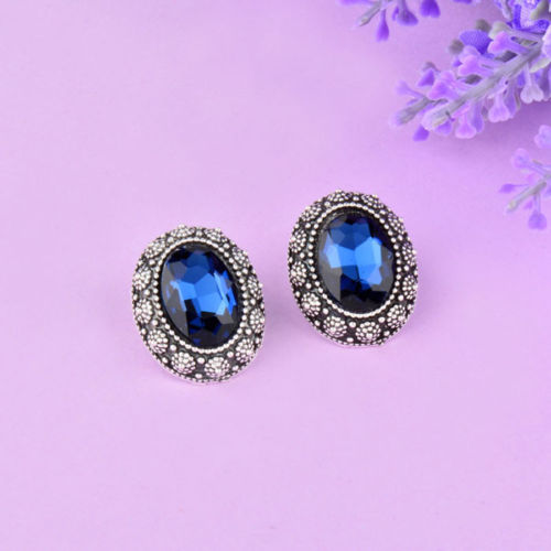 Title (ebay affiliate link): Dark Blue Women Antique Silver Oval Rhinestone Engrave Flower Pattern Earrings