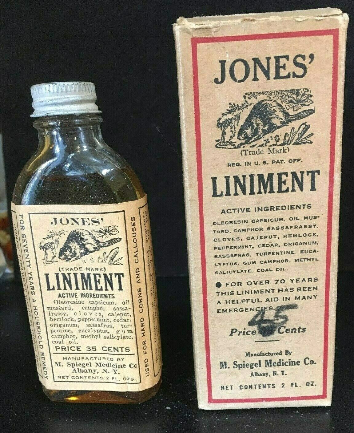 Title (ebay affiliate link): ANTIQUE VTG MEDICINE BOTTLE: JONES'' LINIMENT TIN TOP FULL CONTENTS HEALTH DRUG