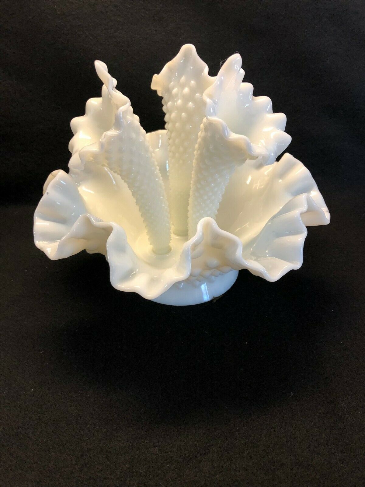 Title (ebay affiliate link): Vintage Fenton Hobnail Milk Glass 3 Horned Epergne Ruffled Bowl Vase