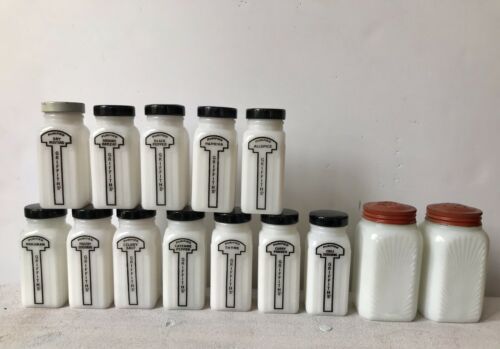 TG Griffith''s Milk Glass Spice Jar Set Black Lids 12 Jars & 2 Large Jars
