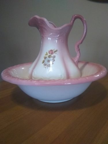 Title (ebay affiliate link): Vintage Large Water Wash Basin Set Pitcher & Bowl White Pink Flowers