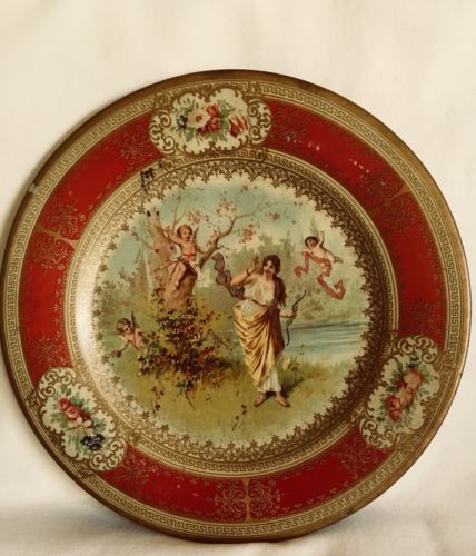 Title (ebay affiliate link): Antique Vienna Art Plate Victorian Tin Litho Maiden W Cherubs Vintage Victorian!