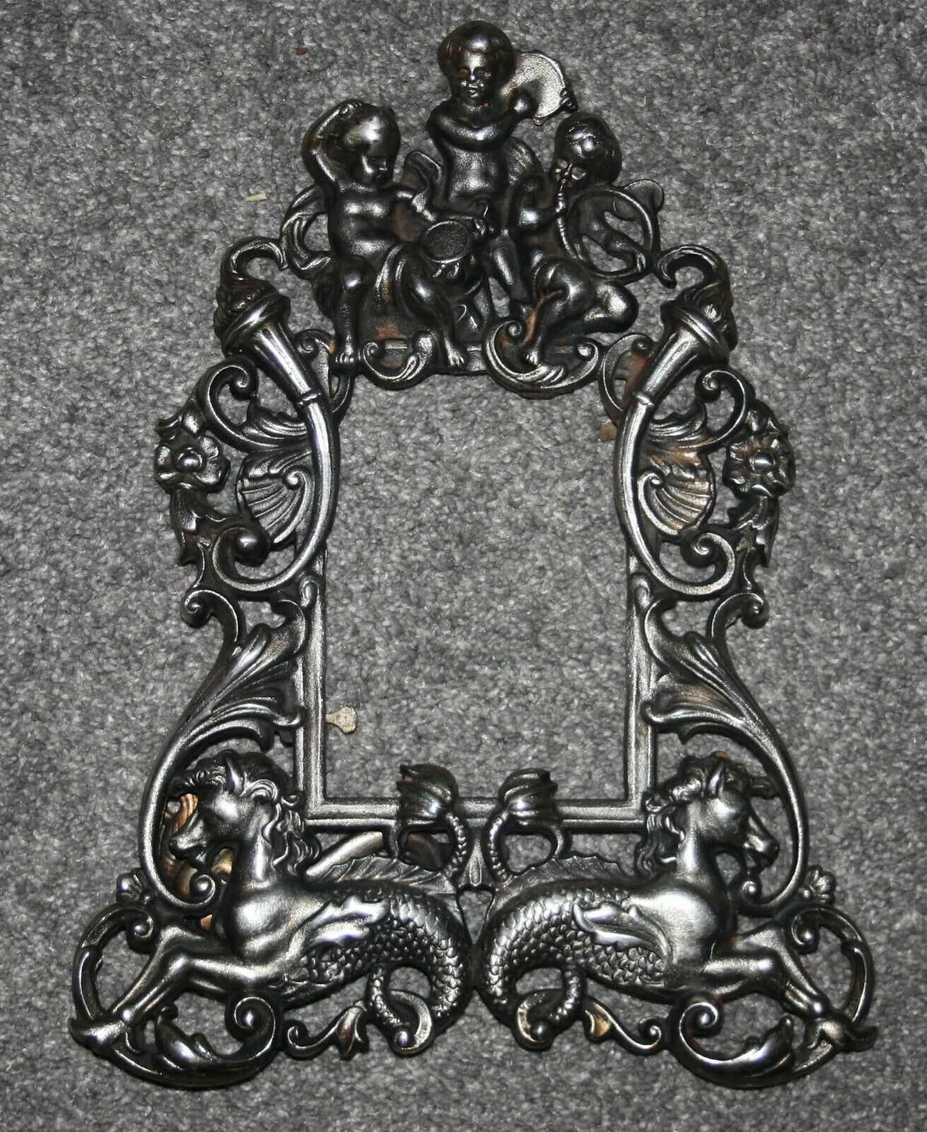 Antique Metal Cast Iron? Photo Frame with Easel Stand Cherubs and Seahorses