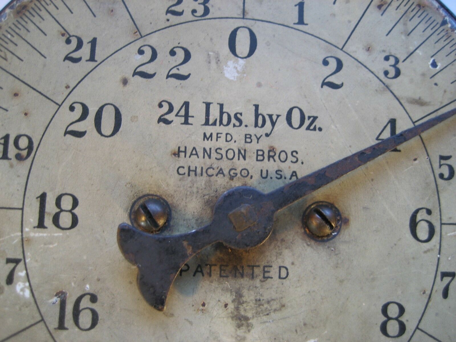 Title (ebay affiliate link): ANTIQUE HANSON BROS. 24 LBS. METAL FACE HANGING GENERAL STORE SCALE