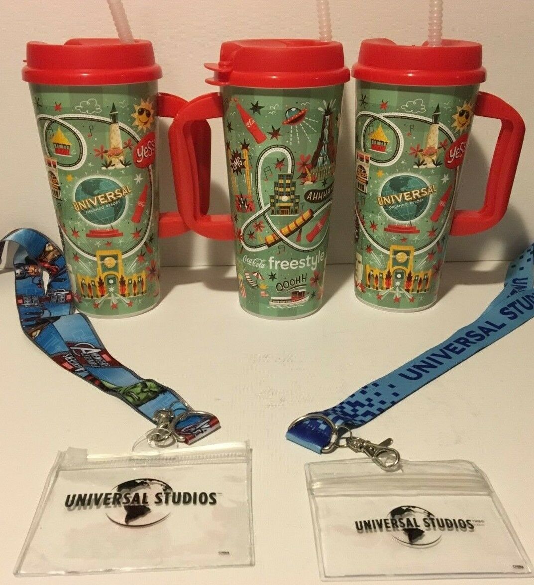 Title (ebay affiliate link): **FAMILY PACK: 3 Universal Studios Freestyle Coca-Cola Souvenir Cups & Lanyards