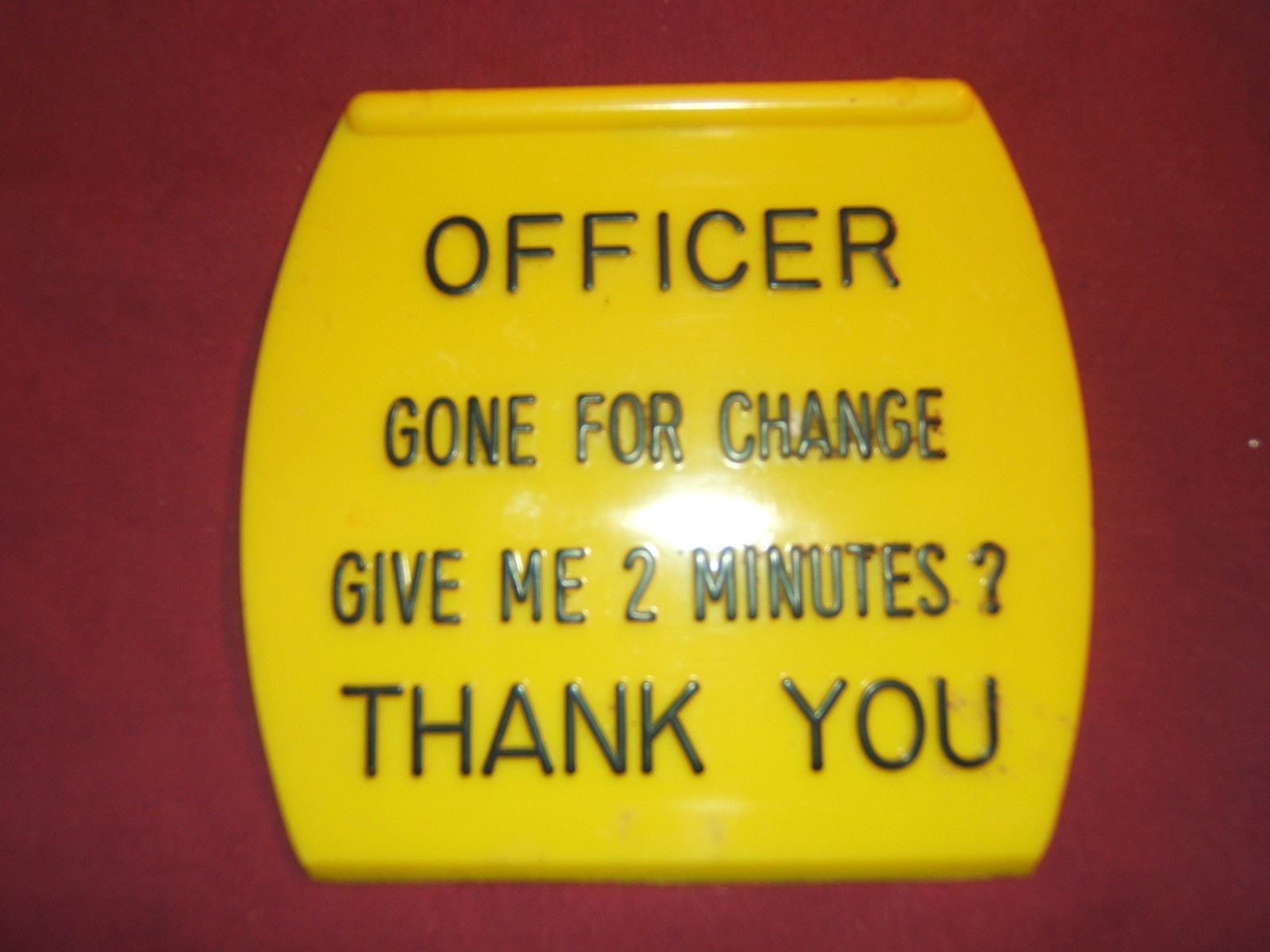 Title (ebay affiliate link): GREAT VINTAGE CAR SIGN ''OFFICER GONE FOR CHANGE-GIVE ME 2 MINUTES? THANK YOU'' AD