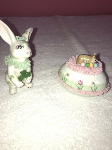 2 IRISH DRESDEN Porcelain Lace Figures Figurines Bunny Egg Easter Shamrock