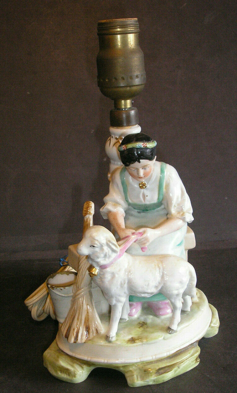 Antique Germany Figurial Porcelain Table Lamp - Lady and Lamb - 10 3/4"